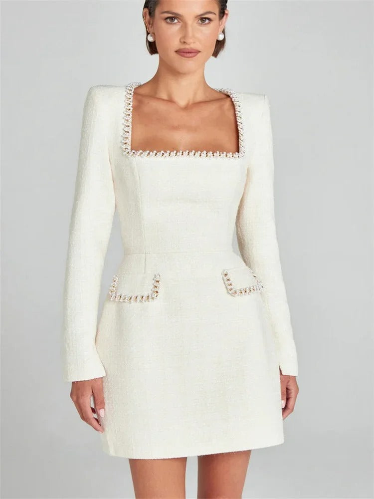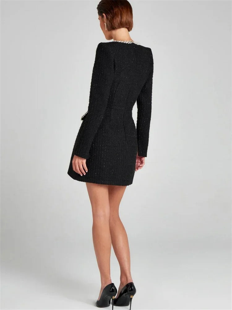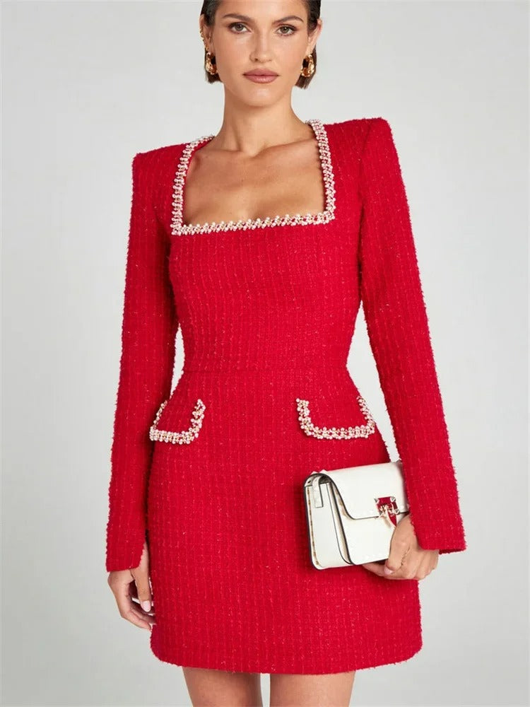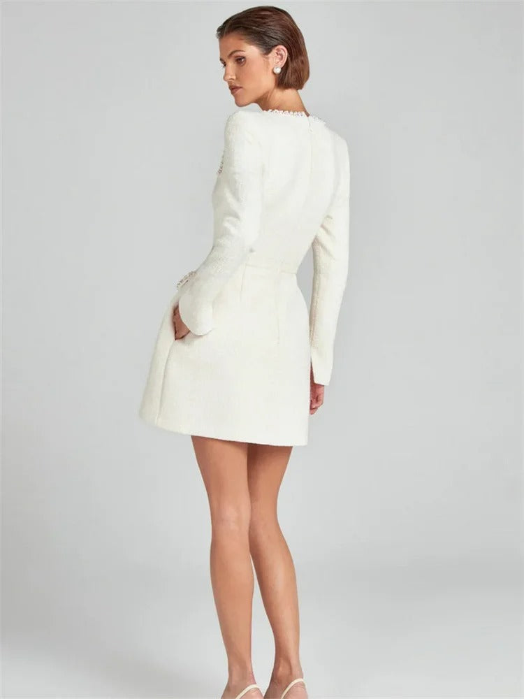 Esta elegante minifalda está confeccionada en tweed especialmente diseñado con un acabado brillante. Las perlas adornan el cuello alto y los detalles de los bolsillos no funcionales. La falda es nuestra característica falda estructurada tipo tulipán. Dispone de prácticos bolsillos a ambos lados y una cremallera oculta en la parte trasera.