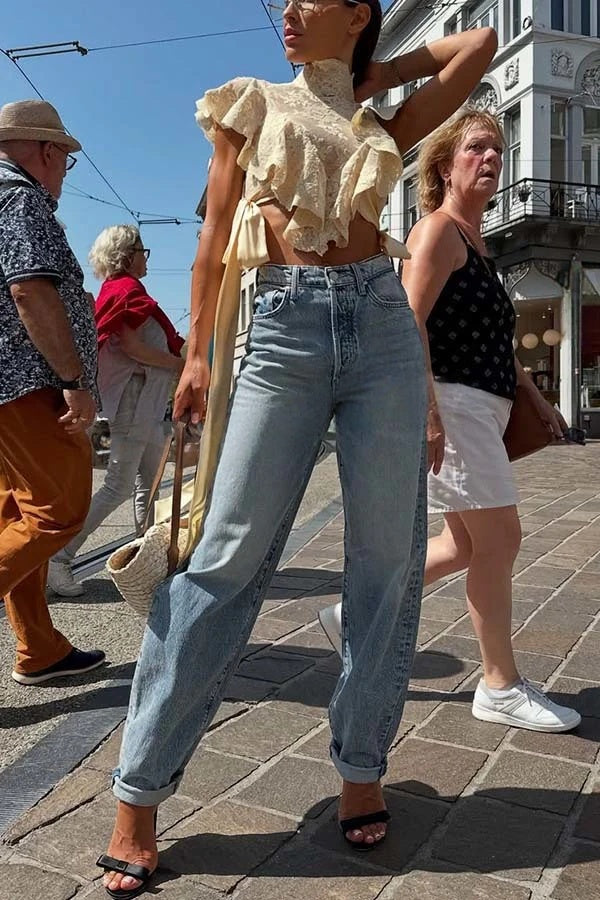 Valeria Martinez compró: Top corto con volantes y pantalón harem de encaje